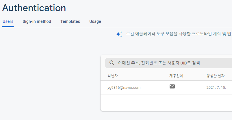 무사히 이메일과 비밀번호가 파이어베이스에 저장됨.