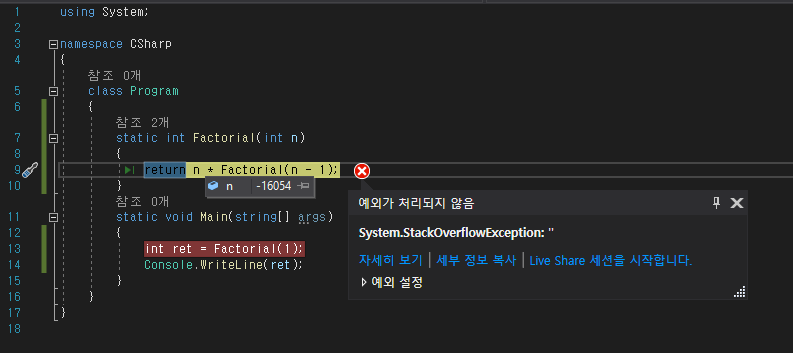 쉽게 말해 Factorial이라는 함수를 불러오는 과정에서 함수 내용 중 Factorial함수를 다시 불러오는 코드가
